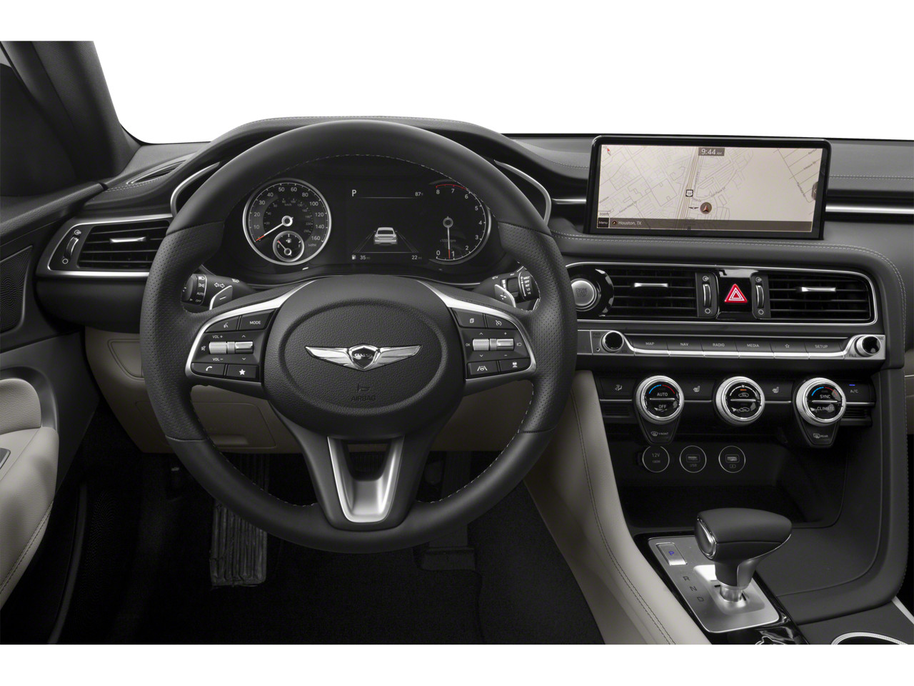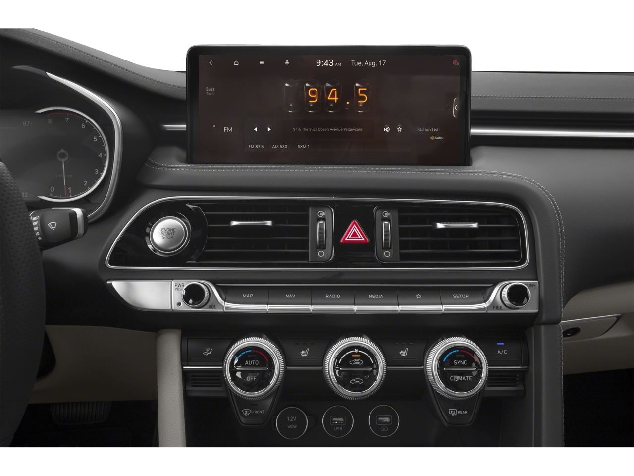 - Radio: Sistema de audio AM/FM/SiriusXM/HD -incluye: 6 altavoces, sistema de navegación de 5ª generación con pantalla táctil de 10.25 plg, sistema dinámico de reconocimiento de voz, enrutamiento conectado, actualizaciones por aire, Android Auto y Apple CarPlay, Genesis connected services, sistema de teléfono a manos libres Bluetooth con difusión de audio y 4 entradas USB